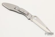 This Police Lockback has a satin finished VG-10 clip point blade with partial serrations and thumb hole. Handle is satin finished stainless steel with stainless steel back spacer (lock), and polished stainless steel tip down clip. Has scratches, otherwise good condition.