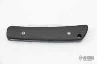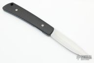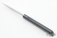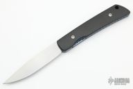 This IMVUBU by Des Horn features a hand rub satin finished Nitrobe 77 blade with notched thumbrest and front flipper. The handle has carbon fiber scales, jeweled and anodized titanium liners, carbon fiber backspacer, lanyard hole at the butt. Nice detent, lockup and blade seating. Comes with a leather slip case. Has a couple light scratches, otherwise excellent condition.