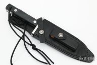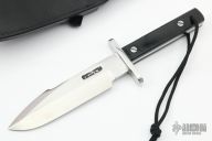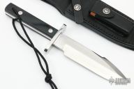 This Model 17 Astro by Randall features a satin finished spear point blade with false top edge, .236" blade stock. 1.392" blade depth, full tang construction. Black linen micarta scales, fastened with removable stainless steel bolts. A slot in the heavy tang and matching hollow inside the handle may be used to carry matches, fishhooks, line and other survival items. The Model 17 was especially designed for the seven Mercury astronauts, who carried them on America's first manned space flights. Astronaut Gordon Cooper did the final design, and two of these historically valuable knives are on display in the Smithsonian Institution. Includes black leather sheath with stone and original paper wrapping. Excellent condition.