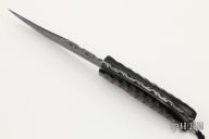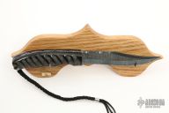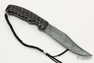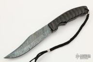 This Hunting Knife by DV Customs features a 285 layer Damascus blade with false top edge and fileworked spine, .185" blade stock and 1.187" blade depth, full tang construction. The handle has buffalo horn scales, and a fileworked tang. Comes with a wooden display stand and COA. New from maker.