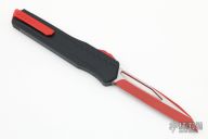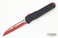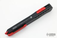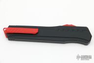 This Cypher OTF is a collaboration between Anthony Marfione and DC Monroe. It features a red standard blade with satin flats and notched thumbrest. The handle has a black anodized aluminum handle with all black hardware, and a black titanium tip down clip and a red titanium insert at the butt with lanyard hole. Comes with original box and papers. Excellent condition. 09/2018 and #0043.