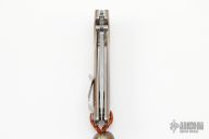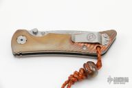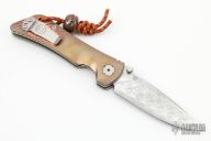 This Spider Monkey Linerlock folder by Southern Grind features a drop point Damascus blade with dual thumb studs and a notched thumbrest. Handle has copper scales over titanium liners and barrel spacers, tumbled stainless steel tip up clip, and lanyard hole.   Includes the original box and papers. Has some patina, otherwise excellent condition.
