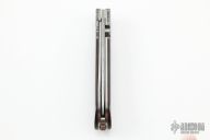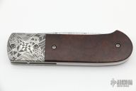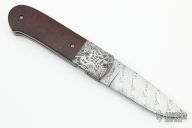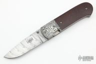 Joe Caswell's EDC folder design with in-line retractable pocket clip won the "Best Innovative Design" at the 2008 Blade Show. The clip retracts between the liners rather than bolting directly to the side of the knife, which is less obstructive and more comfortable than a traditional clip. The location of the clip also reduces the likelihood of the knife falling out of the pocket and being scratched when being carried. This particular EDC has mosaic damascus bolsters, desert ironwood burl scales, and a Damasteel blade. Blade is centered when closed and locks up solid. This piece is in excellent condition.