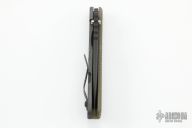 This SNG framelock folder by Mick Strider features a black blade and a dimple pattern green G-10 and flamed titanium frame and tip up titanium clip. Includes a "Lock Bar Stabilizer" for maximum reverse lock retention. Nice detent, lockup and blade seating. New Condition.