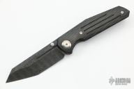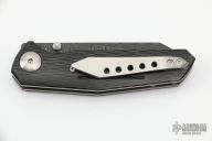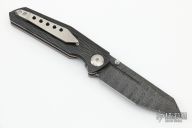 This Pocket Rocket R by Shane Sibert features a Mike Norris Stainless Damascus blade with fullers and dual thumbstuds. The handle has carbon fiber scales with red liners, satin finished titanium liners and tip up clip, satin barrel spacers and hardware. Nice detent, blade seating and lockup. Comes with COA dated 10/2020 and zipper case. Excellent condition.