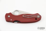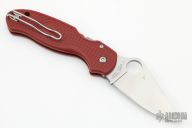 This Para 3 by Spyderco Knives features a satin finished blade with a thumbhole and notched thumbrest. The handle features red FRN scales and a steel tip up pocket clip. Includes the original box and papers. Excellent Condition.