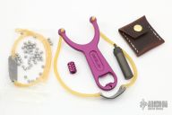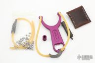 This Sling Pop from Lucas Burnley features a purple aluminum handle with black bands. Includes a replacement band, original sling shot ammo, purple Photon lanyard bead, leather ammo pouch, ball pusher storage can, shop rag. Excellent condition.