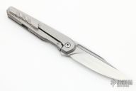 This LHC by Brown Knives features a drop point stonewashed blade with notched thumbrest and flipper. The handle has a milled titanium frame, backspacer and tip up clip with hidden screws. Rides on bearings, nice detent, lockup and blade seating. Comes with original box and COA #024. Excellent condition.