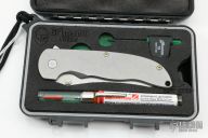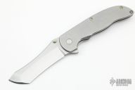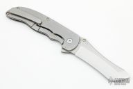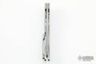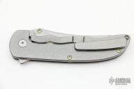 This Norseman (#1634) by John Grimsmo features a stonewashed blade with a single anodized titanium thumb stud, notched thumb ramp and flipper. Stonewash finished titanium frame with anodized titanium screws. Has a matching clip with hidden screws. Very smooth action that requires no wrist movement. Nice detent, lockup and blade seating. Rides on ceramic bearings. Comes with original packaging, custom hard case, Nano-Oil, tool, and COA dated Nov. 8, 2018. Excellent condition.