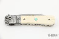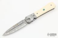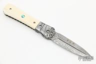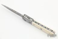 This linerlock by John Thita features a Damascus spear point blade with false top edge, fullers and three brass Dellana Dots. The handle has fileworked and fluted Damascus bolsters, mammoth ivory scales with abalone inlays, fileworked stainless steel liners and backspace with abalone inlays. Nice detent, lockup and blade seating. Excellent condition.