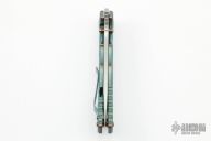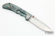 This Harsey framelock folder by Spartan Blades features a stonewashed drop point blade with dual thumbstuds and a notched thumbrest. The handle has an anodized titanium frame with a laser engraving a tip up titanium clip and filler tab. Has nice detent, lockup, and blade seating. Comes with original box. Excellent condition.
