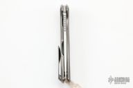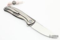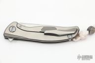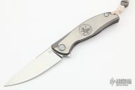 Shirogorov Custom Division White Tiger F95 Chinese Special Edition #46 of 50. 3.75″ stonewashed S90V blade with hand-rubbed satin flats 8.75″ overall length Runs on single row roller bearings Weighs 4.9 ounces Custom Division pivots Countersink around the pivots looks like pivot collars 3D machined 2-tone satin/stonewashed & bronzed Titanium handle scales Presentation-side Titanium handle scale etched with one of the Chinese Four Auspicious Beasts, the White Tiger of the West Inside of frame-lock milled to reduce weight Steel insert in lockbar Satin Titanium standoff Tip up 3D machined two-tone satin/stonewashed & bronzed Titanium pocket clip attached with hidden hardware Comes with white 550 paracord lanyard with Special Edition Pivot bead Special Edition pivot bead etched with the Chinese characters for “White Tiger” Limited to 50 pieces worldwide.