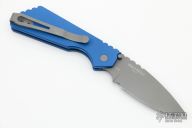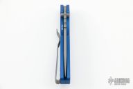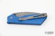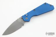 This Pro-Strider PT by Pro-Tech and Strider Knives features a stonewashed 154CM blade with notched thumbrest. The handle has a blue aluminum frame with grey hardware and stonewashed stainless steel tip up clip. Comes with original box and papers.  Excellent condition.