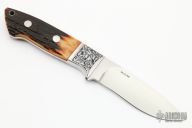 This integral hunter by Ricardo Velarde features a hand-rubbed satin finished drop point blade with .185" blade stock and 1.104" blade depth, full integral construction with tapered tang. The handle has well matched stag inserts with red liners and stainless steel pins, engraving on the bolsters was done by L. Bandikova. Comes with a zippered case. Excellent condition. Marked "One of a Kind" on the blade.