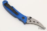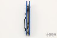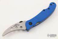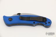This Elvia Trainer by Emerson Knives features a tumbled hawkbill trainer blade with thumbdisc. The handle has blue G-10 scales, titanium liners and a black stainless steel tip up clip. Excellent condition.