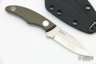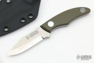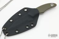 This Cayenne Necker by Tom Krein came out of a TKI 2018 Box Set, it features a satin finished clip point scandi ground AEB-L blade with notched thumbrest, .107" blade stock and .666" blade depth, full tang construction. The handle has green G-10 scales with black liners and lanyard hole. Includes a black kydex neck sheath with ball chain. Excellent condition, from the 2018 TKI.