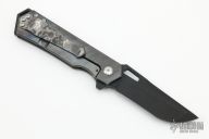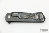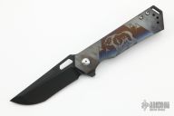 This Hagakure framelock flipper by Steel Flame features a black tumble finished tanto recurve blade with flipper. The handle has a bead blasted titanium frame with laser engraved California Bear, and a laser engraved tip up clip, black titanium backspacer with lanyard hole. Nice detent, lockup and blade seating. Comes with Velcro case. Excellent condition.
