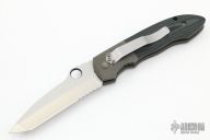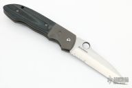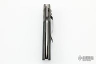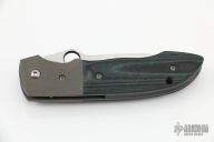 This Left Handed linerlock folder by Allen Elishewitz features a satin finish partially serrated drop point tanto blade with notched thumbrest and thumbhole. The handle has bead blasted and dovetailed titanium bolsters, black/green G-10 scales bead blasted titanium liners, black G-10 backspacer, and a tip up bead blasted stainless steel clip. Smooth action. Nice lockup and blade seating. Comes with a velcro pouch. Has a slight ding in the backspacer. Excellent condition otherwise.
