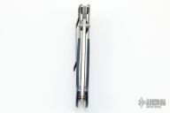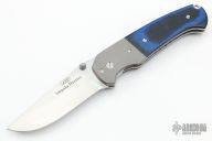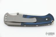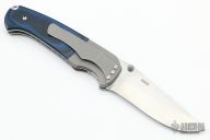 This ADV linerlock features a hand rub finish drop point blade with notched thumbrest and dual thumbstuds. Bead blasted titanium bolsters with black/blue G-10 scales, polished titanium liners and tip down clip. Smooth action with a nice detent, lockup and blade seating. Has some light scuffs, otherwise excellent condition.