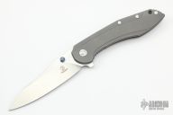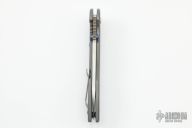 This Tolk Mid-tech by Brad Southard features a stonewashed finished blade with satin grinds, notched thumbrest and flipper. The handle has a custom stonewash finished titanium frame with matching tip up clip, anodized titanium barrel spacers, lockbar stabilizer and pivot collar. Light scratches are visible on the blade and handle otherwise the knife is in excellent condition.
