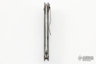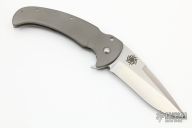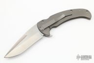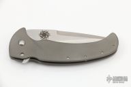 This Lefty Aftershock flipper by Brad Duncan features a satin finished blade with false top edge and flipper. The handle has bead blast finish titanium scale and frame, standoff/barrel spacers and a tip down bead blasted titanium clip. Nice detent, lockup and blade seating. Comes with nylon velcro case. Has a few light scratches, otherwise excellent condition.