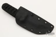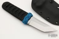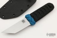 This Fixed Blade by Josh Mason features a hand rub satin finish blade with swedge, .139" blade stock, 1.14" blade depth with hidden tang construction. The handle has a Turk's head knot as a guard, and a wrapped handle over black cord. Comes with a Kydex sheath with belt loop. New from maker.