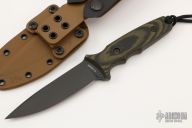 "Spartan Harsey TT – The Harsey TT (Tactical Trout) was designed to be a very comfortable and robust mid-sized knife for most field tasks and defensive use. The TT’s size makes it easy to carry and wield. The spear point profile has a flat ground main bevel with a tapered top grind. The blade profile provides for a clean cutting edge with excellent tip strength. The Harsey TT’s full tang and handle provide for neutral balance in the user’s hand. The contoured ergonomic linen Micarta handle provides for a comfortable confident grip when wet or dry. The pommel has a lanyard hole in the middle of its angled tip. A great all around fixed blade, the TT is well-balanced in its size, function and feel. One of William Harsey's best designs in our opinion." S45VN Blade Steel. .189" Blade Stock. 1.113" Blade Depth. Comes with kydex sheath, original box and papers. Excellent condition.
