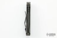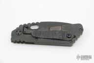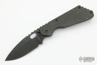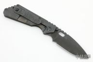 This PT by Strider features a black blade with notched thumbrest and thumbhole. The handle has a black G-10 and bead blasted flame anodized titanium frame with matching tip up clip. Has some scuffs and scratches, good user condition.