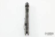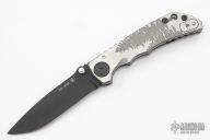 This Harsey framelock folder by Spartan Blades features a black drop point blade with dual thumbstuds and a notched thumbrest. The handle has a titanium frame with a laser engraving, a tip up titanium clip and filler tab. Has nice detent, lockup, and blade seating. Blade steel: S45VN. Light scratches are visible on the frame otherwise the knife is in good condition.