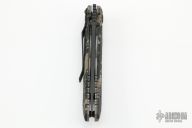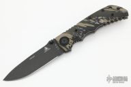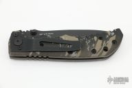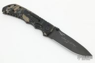 This Harsey Tactical Folder from Lone Wolf Knives features a black drop point blade with notched thumbrest, and dual thumbstuds. The handle has plastic scales, tumbled titanium liners, barrel spacers, and a black tip down stainless steel pocket clip. Nice detent, lockup and blade seating. Comes with a black nylon sheath and the original box.  Light scratches are visible on the blade otherwise the knife is in excellent condition. This knife was signed by Bill Harsey in 2007.  This is the predecessor of the popular T3 Harsey model that followed.