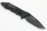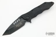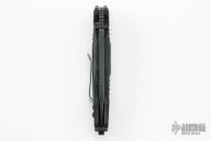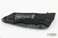 This Helix framelock flipper by Guardian Tactical features a black blade with dual thumbstuds, flipper, and notched thumbrest. The handle has a black G-10 frame, black titanium backspacer and tip up stainless steel clip. Nice detent, lockup and blade seating.  #0744 on clip and dated 01/2015.  Includes the original box and papers.  Light scratches are visible on the pocket clip otherwise the knife is in excellent Condition.
