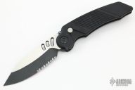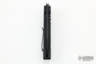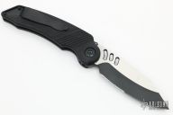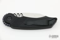 This MRX by Rat Worx features a black clip point blade with satin flats. The handle is black aluminum with a chain drive opening mechanism. Tip up black stainless clip. Comes with original box, zippered case and papers. Excellent condition.