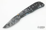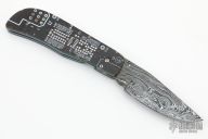 This linerlock by Jake Elenbaas features an up swept Alabama Damascus blade with single thumbstud. The handle has mother board scales, anodized titanium liners and a black G-10 backspacer. Comes with felt pouch and COA. New From Maker.
