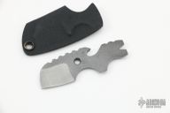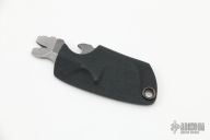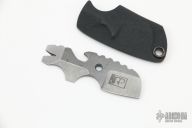 The Toucan is designed to be carried on a keychain and provides an all in one tool you can have on you always. The Toucan has 5 basic tool ideas: a cutting edge, bottle opener, pry tip and nail puller/wire stripper (can also double as a small flathead screwdriver for Phillips or smaller flathead screws ) and a regular sized flathead screwdriver. It is made from .188" thick and carried in a kydex sheath. Has a couple light scuffs, otherwise excellent condition.
