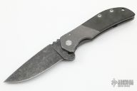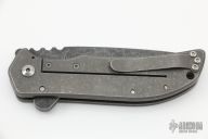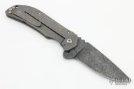 This El Patron Framelock Flipper has a dark acid washed drop point blade with flipper and notched thumb rest. Handle is stonewashed titanium with green micarta A-side overlay, lanyard hole, and stonewashed titanium tip up clip. Nice detent, lockup and blade seating.The tip of the blade is missing otherwise the knife is in Excellent Condition.