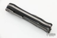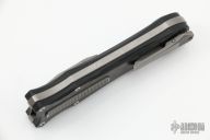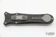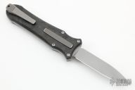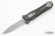 This knife is a Deadlock Model B. It has a double edged stonewashed blade. The handle has a carbon fiber and stonewashed titanium frame with a tip down spring clip, stonewashed titanium. The thumb slide on the handle is also titanium and handle has titanium overlays. Comes with a drawstring bag and card. Grant and Gavin Hawk set out to create a double action OTF with no blade play.... They did it, NO blade play. Has some scuffs and scratches, otherwise excellent condition.
