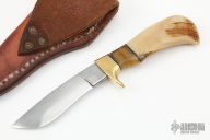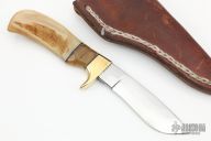 This Pronghorn by Master Smith Bill Burke features a 52100 hand forged drop point blade with visible temper line, .190" blade stock and 1.064" blade depth, hidden tang construction. The handle has a brass guard and sheep horn handle. Includes a brown leather belt sheath.  This knife was used but not abused. Has a couple light scratches, otherwise good condition.