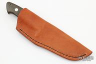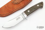 This Nessmuk from James Sponaugle features a mirror polished upswept drop point blade with .189" blade stock and 1.152" blade depth, full tapered tang construction. The handle has a stainless steel single guard with green micarta scales over red liners/spacers. Includes leather sheath with belt loop. Excellent Condition.