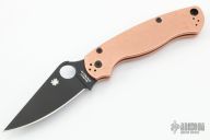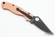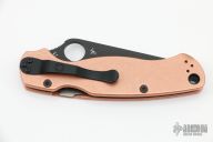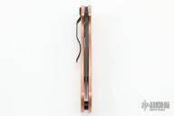 This Paramilitary 2 Linerlock Folder has a black clip point REX45 blade with thumb hole and notched thumb rest. Handle is tumbled copper with stainless steel liners and stainless steel 4-way reversible clip. Excellent condition. Comes with original box and papers.