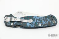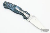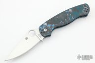 This Paramilitary 2 Linerlock Folder from Spyderco has a satin finished clip point blade with thumbhole and notched thumb rest. Handle has black/blue carbon fiber scales with nested stainless steel liners and stainless steel clip, custom black hardware. Comes with original box and papers. Excellent condition.