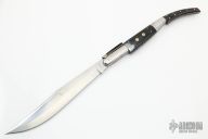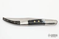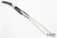 This knife by JJ Martinez features a satin finished blade with false top edge. The handle has stainless steel bolsters and buffalo horn scales pinned with brass pins, stainless liners and backspacer. Ratchets when opening. Interesting design. Has some scratches, otherwise good condition.