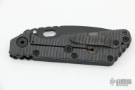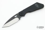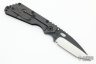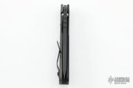 This Mick Strider SMF Black Panther framelock folder features a two-tone hand ground blade with thumbhole and notched thumbrest. The handle has a black aluminum and flamed titanium frame with titanium clip, tip up clip. Jimping on blade spine. Nice lockup, detent, and blade seating. New from the 2022 CCKS. 1 of 4.