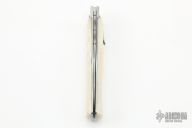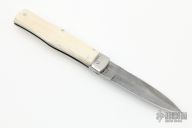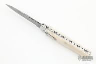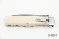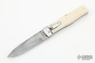 This lever auto from Mikov Knives has a Damascus spear point blade with false top edge. File-worked blade spine. The handle has polished stainless steel bolsters and liners, and bone scales. Action is smooth and strong. Excellent Condition.