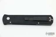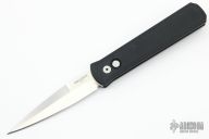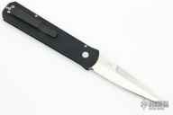 This godfather from Pro-Tech Knives features a satin finish drop point blade with false top edge. The handle has a black aluminum frame with black hardware and black stainless steel tip up clip. Comes with original box and papers. Has some scratches on the blade and handle. Great condition otherwise.