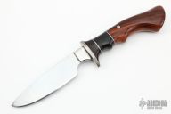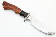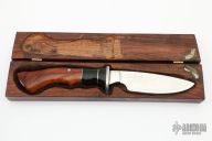 This Drop Point Hunter by Tedford features a satin finished drop point blade with a hidden tang construction.  .174" Blade Stock.  1.250" Blade Depth.   The handle features a nickel silver guard and a wood grip.  Includes a wooden display case.  Light rust is visible on the blade and guard.  Light scratches are visible on the blade and handle otherwise the knife is in good condition.