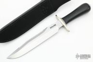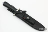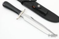 "The Model 1 was made famous by Allied combat troops in World War II and has since been widely used in all theaters of war." .211" blade stock and 1.280" blade depth, hidden tang construction. Has a satin finished blade with sawteeth and sharpened top edge. Nickel silver guard, duralumin butt, black linen micarta grip with black/duralumin spacers. Includes black leather sheath and original paper wrapping. New from maker.