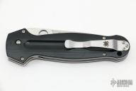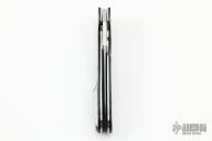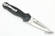 The EuroEdge’s dramatic, near-symmetrical blade is precision machined from CPM® S30V® particle metallurgy stainless steel and features several fullers to reduce its weight and strengthen it. The bead-blasted fullers stand in contrast to the blade’s beautifully executed satin finish to further highlight their presence. The blade’s single cutting edge is balanced by a long swedge (unsharpened bevel) and Spyderco’s Trademark Round Hole™ for quick, positive, one-handed opening.