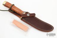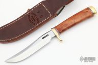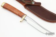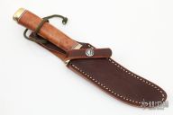 This Model 7-5 by Randall Made Knives features a satin finished upswept blade with false top edge, .156" stock and .912" blade depth, hidden tang construction. The handle has a brass guard and butt with red/white/blue spacers and a thuya burl wood handle. Comes with brown leather sheath and original paper wrapping. New from maker.
