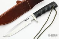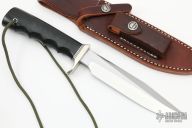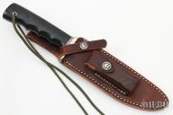 This Model 5 Camp and Trail Knife by Randall Made Knives features a satin finished blade with false top edge and notched thumbrest, .196" blade stock and 1.142" blade depth, hidden tang construction. The handle has a nickel silver single guard and a black linen micarta grip with black and duralumin spacers and a compass in the butt. Comes with a brown leather sheath with belt loop and original paper wrapping. New from maker.