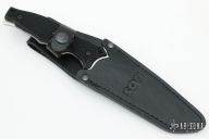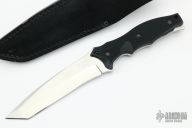 This knife features a satin drop point tanto blade with notched thumbrest, .158" blade stock and 1.27" blade depth, full tang construction. The handle has black plastic scales and a lanyard hole at the butt. Comes with a black leather sheath and original box. Excellent condition. Blade Steel: VG-10